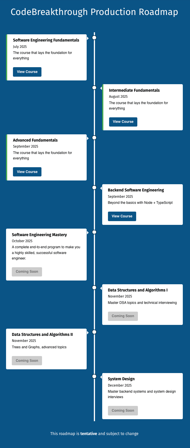 Hey fam, this email is a big one. Lot's of good stuff. today I want to share with you a course roadmap for software engineers, my new YouTube video, and everything that is going on at CodeBreakthrough right now! Hi, it's Caleb from CodeBreakthrough! If you'd like to unsubscribe from the newsletter completely, unsubscribe here. You may have noticed an increase in talk from me about my new courses. It's not random, it's part of a larger picture... We'll be releasing a series of courses that...